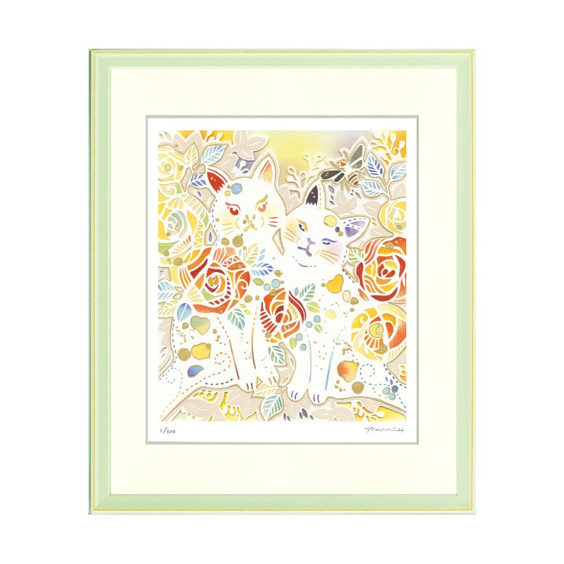 平石智美「黄色のバラと2匹のねこ」452×376mm