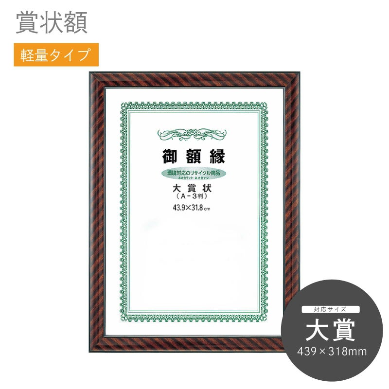 額縁の移動、設置などが容易に行え非常に使い勝手の良い額縁となっています。昔からある定番のデザイン。濃い目の茶色に独特の縞模様が入っているのが特徴です。表彰状、許可証などを飾るのにオススメ。なおサイズに関しましては賞状独自のサイズなどもあり注意が必要です。お手持ちの賞状のサイズをきちんとお測りの上、お買い求めください。