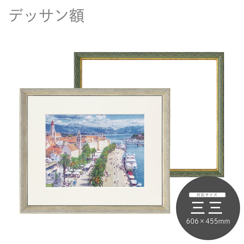 グリーンとホワイトの2色のカラー展開となっています。どちらのカラーも装飾の雰囲気を壊さぬよう、くすんだようなアンティーク風の加工を施しており豪華かつ落ち着きのある印象の額縁になります。