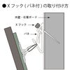 釘を壁面に斜めに打ち込み金具をしっかり固定します。錆に強いステンレス製で木壁、石膏ボードに使用可能。