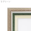 装飾部分は汚し加工を施しアンティークを感じさせる仕上り。また内側部分ですがゴールドにはゴールド、シルバーにはグリーンのラインが入り同型ながらカラーによって雰囲気が異なって見えるような仕上がりです。ライナーも通常の白系の麻ではなく、額縁のカラーと調和するようベージュを採用しています。