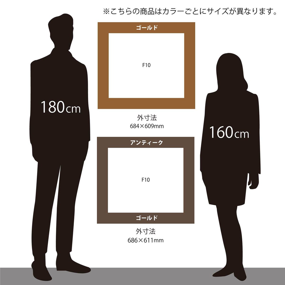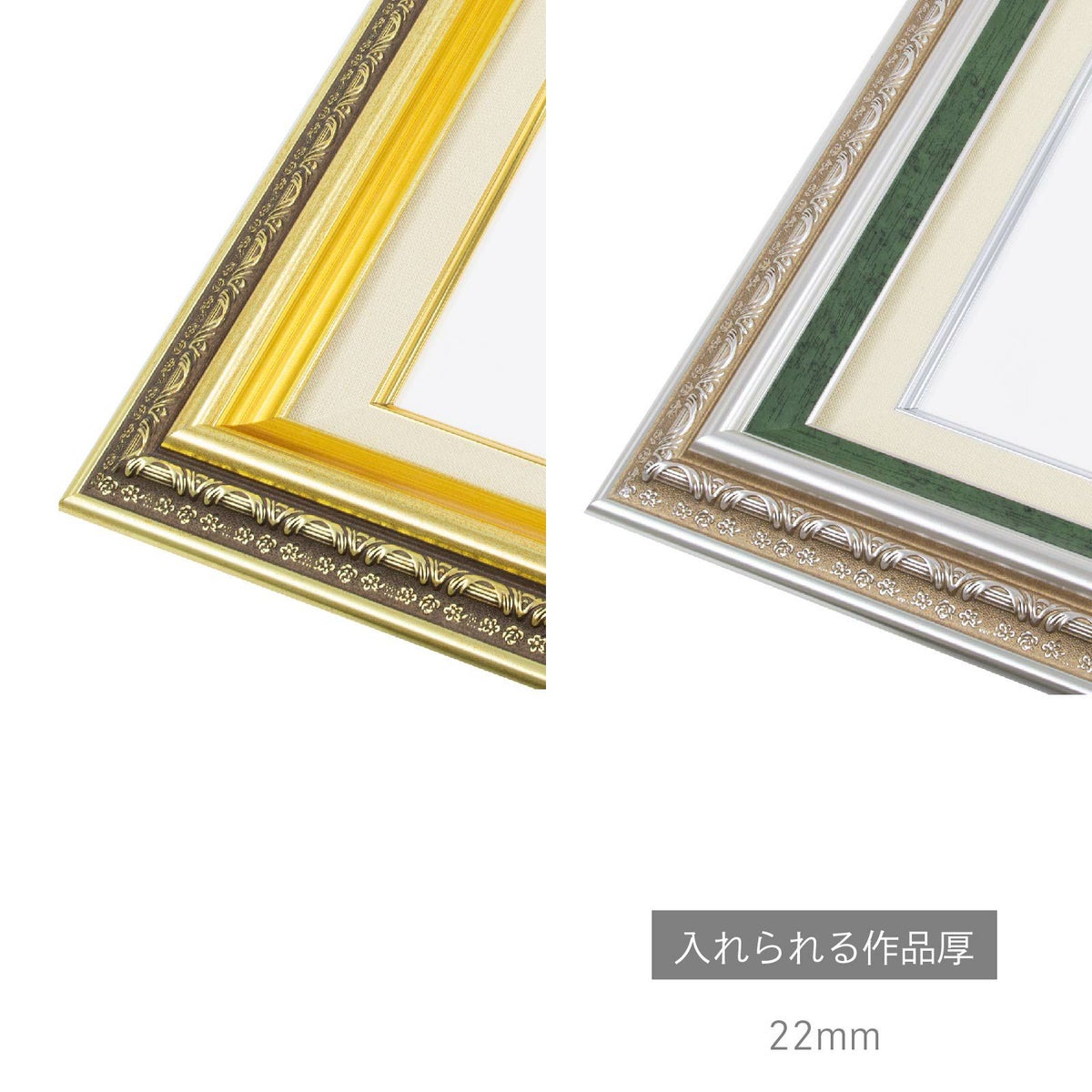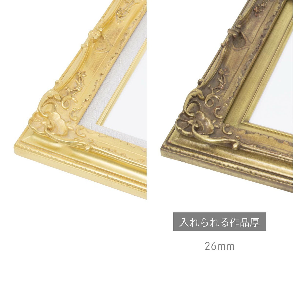 ベーシックなゴールドとシルバーの額縁で、どんな作品にも合わせやすく使い勝手抜群です。