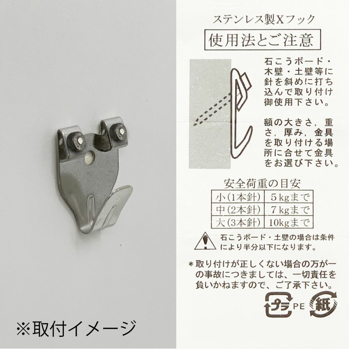 他の画像を見る 吊金具 ステンレスXフック 大 ¥ 462 税込 釘を壁面に斜めに打ち込み金具をしっかり固定します。錆に強いステンレス製で木壁、石膏ボードに使用可能。 コンクリートには使用できませんのでご注意下さい(コンクリートは専用の金具がございます)。 安全荷重は大(3本釘)で約10㎏までの重さに対応可能。 (※石膏ボードの場合は条件により半分以下になります) 額縁の大きさ、重さ、厚み、取り付ける場所などに合わせて種類をお選び下さい。 重量のある額縁、大きな額縁は同じ高さに少し離して2つ使用していただくと安定します。 カートに入れる お気に入りに登録する